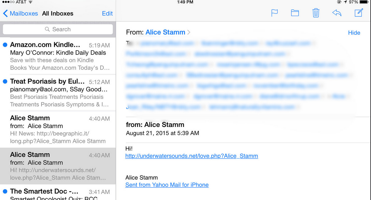 … it was sure freaky to look at my email list today and see 2 emails from Alice. Her email has apparently been hacked and I recognized several of the other email recipients.